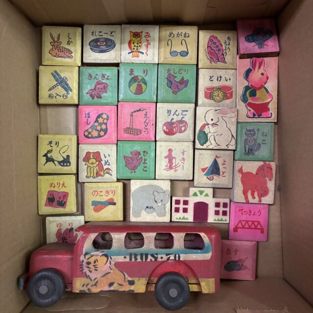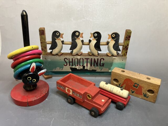昭和20年代のものと思われる知育玩具、積み木、輪投げ